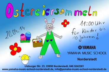 Am Ostersonntag, 05.04.2015 um 11:00 Uhr ist es wieder soweit: Ostereiersammeln in der YAMAHA Music School Norderstedt für Kinder bis 10 Jahren. Umrahmt wird das Ganze mit Musikeinlagen von Schülern unserer YMS!