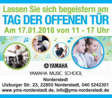 Die Yamaha Music School Norderstedt öffnet ihre Tore von 11 - 16 Uhr am Sonntag, 21.01,2018 für Interessenten jeden Alters. Lernen Sie uns kennen und erleben Sie, mit welcher Freude bei uns allein, zu zweit und in der Gruppe musiziert werden kann. Überzeugen Sie sich selbst.